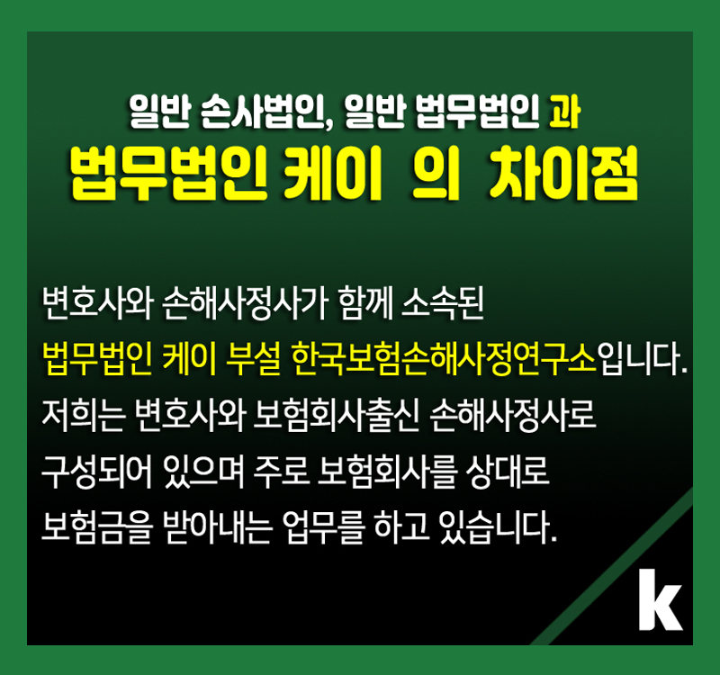 저희는 변호사와 손해사정사가 함께 소속된 법무법인 케이 부설 한국보험손해사정연구소입니다.