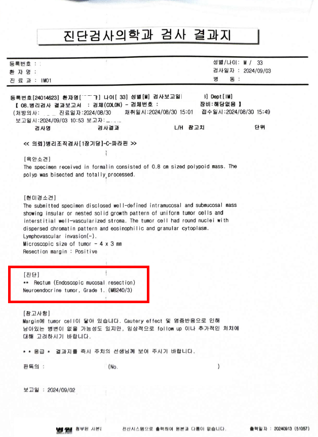 – 제거된 종양에 대한 조직검사결과 4mm 크기의 신경내분비종양 1등급(Neuroendocrine tumor, Grade 1(M8240/3))으로 확인