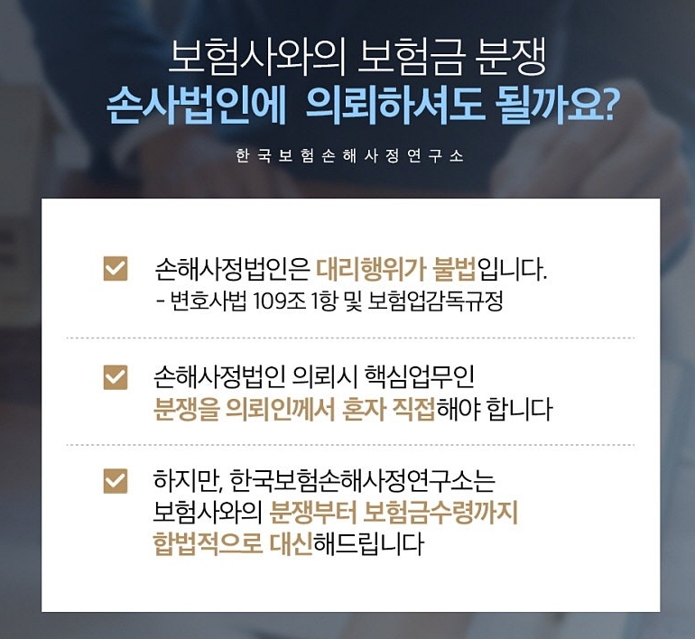 보험사와의 다툼에서 혼자 대응하기보다, 변호사와 손해사정사가 함께하는 한국보험손해사정연구소와 상의하시길 권해드립니다.